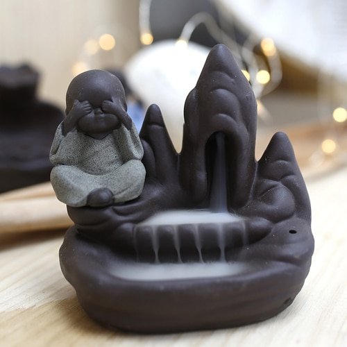 Quemador de incienso de reflujo efecto fuente de humo en cascada para conos de incienso con humo de reflujo, con pequeño monje meditando por donde pasa el humo como si fuese un flujo de agua.